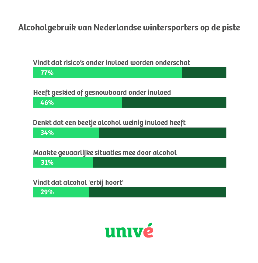 Het onderzoek laat zien dat bijna de helft van de wintersporters weleens heeft geskied of gesnowboard terwijl ze alcohol hadden gedronken (46%). Voor velen hoort een drankje op of langs de piste bij de wintersportbeleving: ruim een kwart van de Nederlanders vindt het gebruik van alcohol vóór of tijdens het skiën of snowboarden vanzelfsprekend (29%). Tegelijkertijd denkt ruim een derde van de wintersporters (34%) dat een kleine hoeveelheid alcohol weinig invloed heeft op het reactievermogen op de piste.