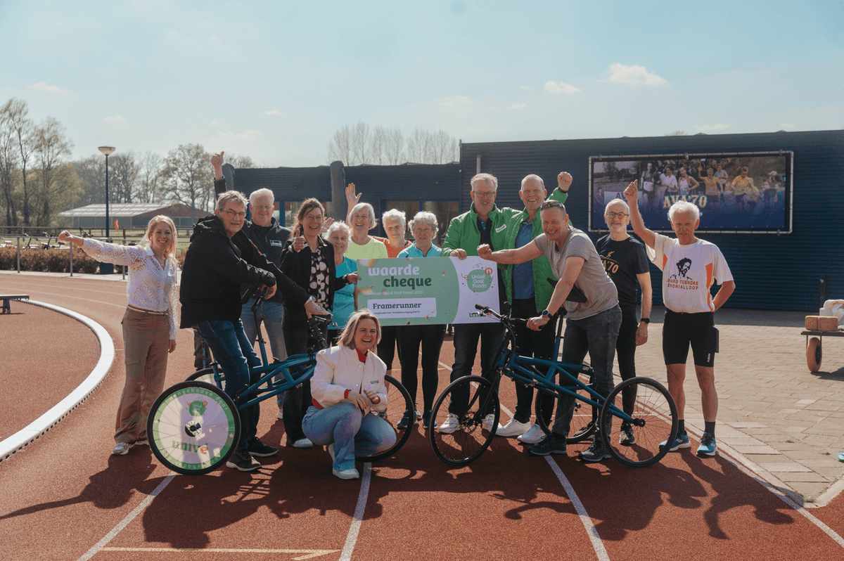 Martin: “Sporten was altijd mijn ding. Tot ik een herseninfarct kreeg. Sindsdien ben ik extreem duizelig en kan ik niet goed lopen. Via mijn fysiotherapeut hoorde ik over framerunning bij AVA ’70. Toevallig startte de voorzitter net een pilot met een loopgroep voor framerunners. De club had één running frame en huurde er tijdelijk een paar bij. Er was geen geld voor de aanschaf van een tweede frame. Gelukkig sprong het Univé Oost Fonds bij.”