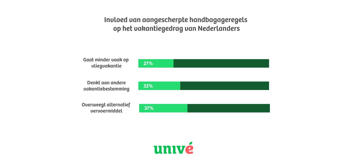 De infographic geeft in percentages de invloed van de aangescherpte handbagageregels aan op het vakantiegedrag van Nederlanders. Zo gaat 27% van de Nederlanders minder vaak op vliegvakantie. 32% van de Nederlanders denkt eraan om naar een andere bestemming te gaan en 37% overweegt met een ander vervoermiddel te reizen.